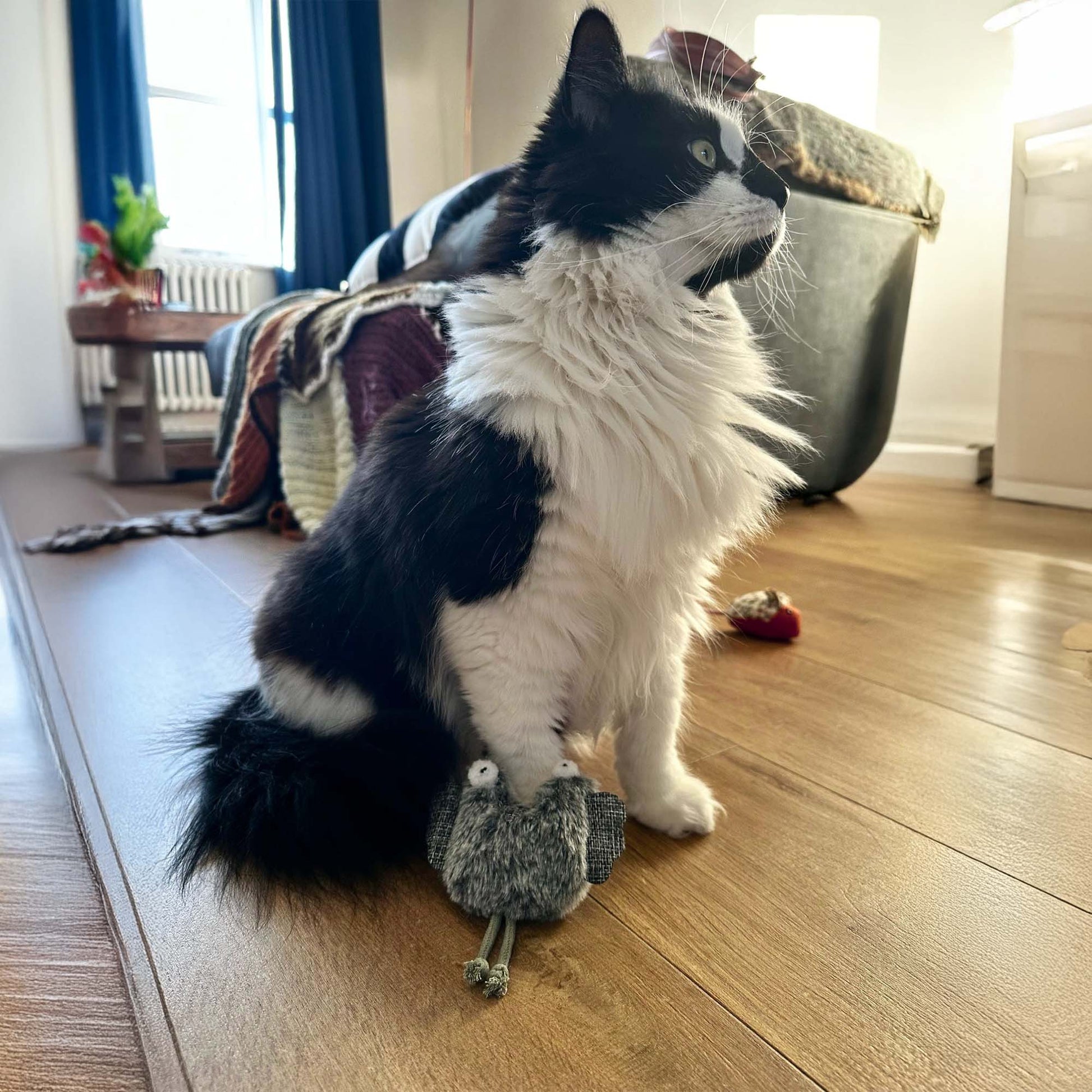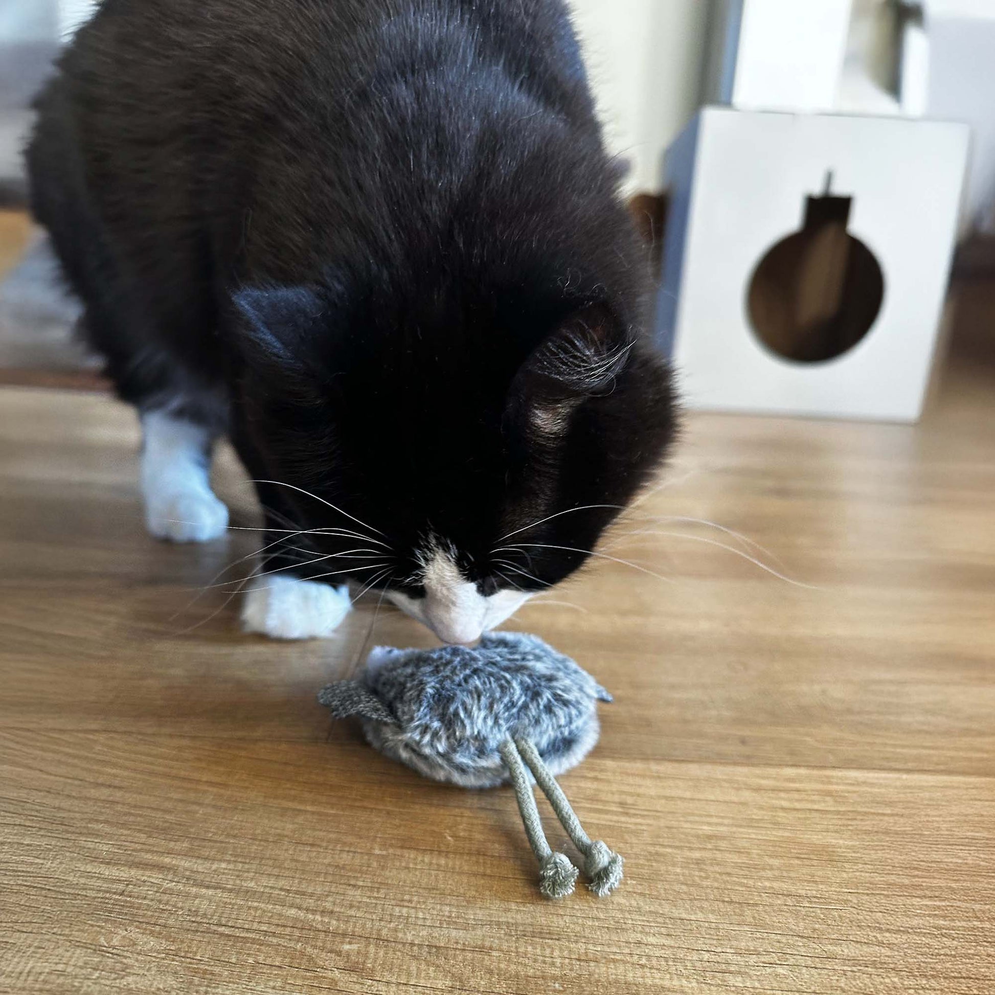 IC chip-generated prey sounds trigger hunting instincts, while the multitextured body-combining soft plush fur and durable canvas-mimics the texture of real prey and provides versatile indoor play.