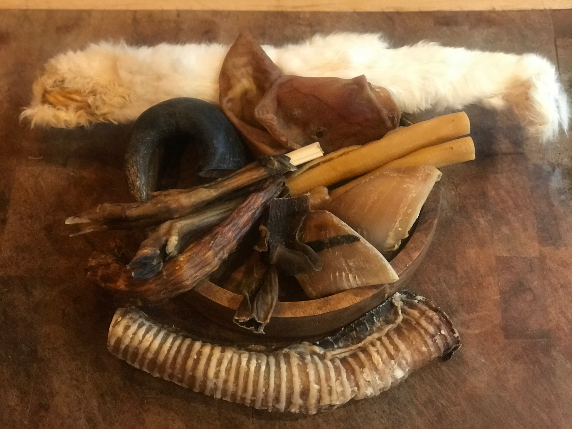Indulge your pet in a variety of natural chews and treats, including complete rabbit skin with hair, cow hooves, pigs ears, doe legs, pork rind rolls, a medium buffalo horn, and camel skins. They'll love the flavor and texture of these healthy snacks.