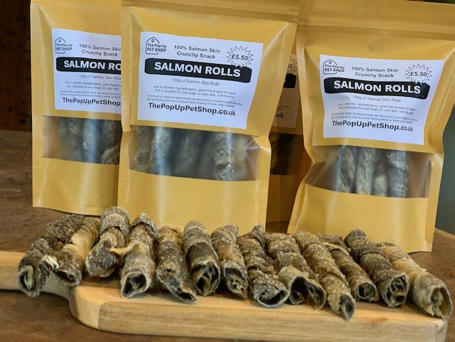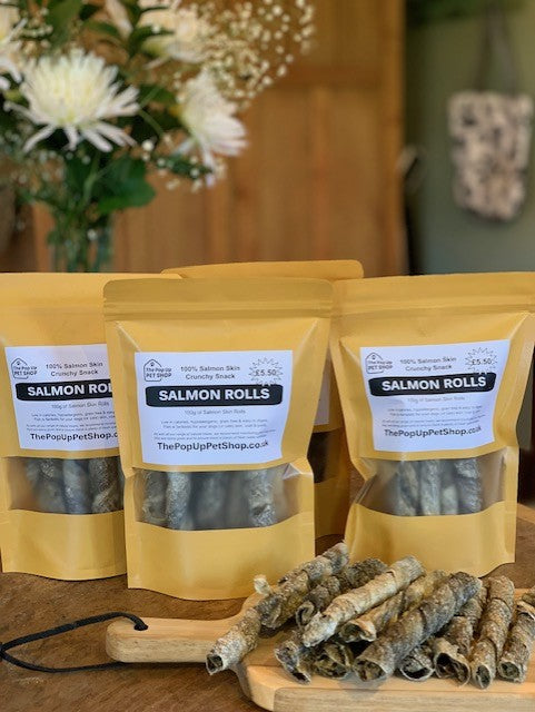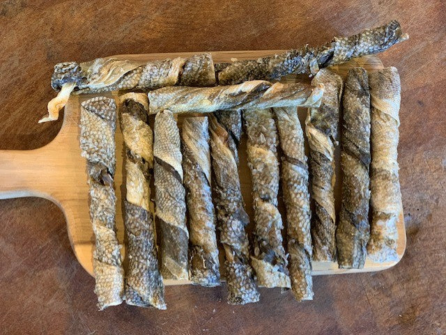 Salmon skin makes a crunchy, satisfying snack that’s both delicious and beneficial for your dogs (or cats) overall well-being.